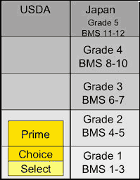 Wagyu beef's quality is so high that it does not fit on the U.S. chart. The Japanese beef grading scale has a range of 1-12, with twelve being the best meat possible. A score of 12 is extremely rare; a good cut of Wagyu beef usually ranks around 10. The chart below compares the USDA scale to the Japanese scale.